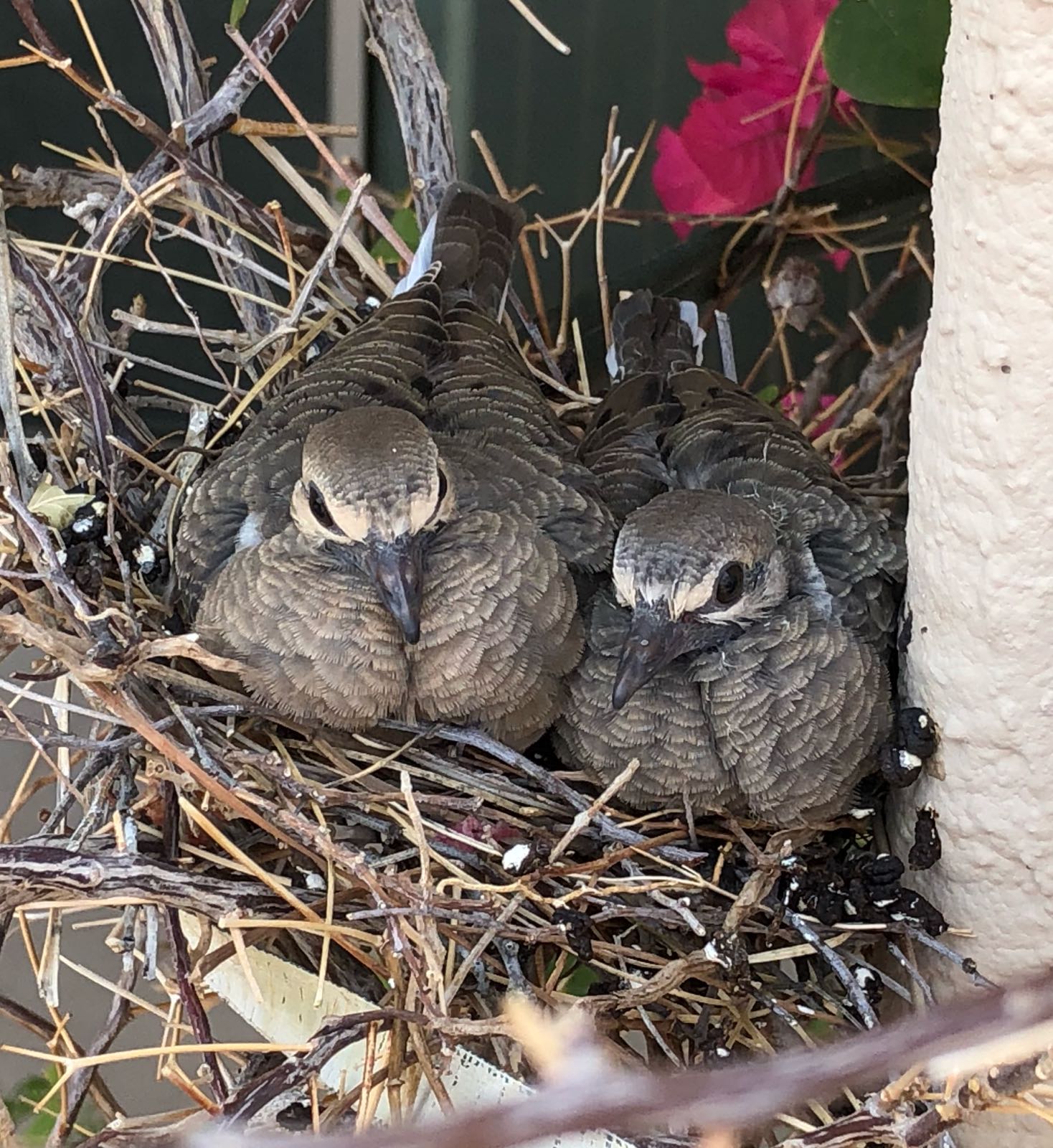 மகன் வீட்டில் தோட்டத்தில் (அரிசோனா) போகன்வில்லா(காகிதப்பூ )கொடிக்கிடையில் மணிப்புறா கூடு கட்டி முட்டையிட்டு இருப்பதை போட்டோ எடுத்து அனுப்பினான் . எனக்குப் பிடிக்கும் என்று.