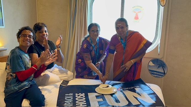 எங்கள் இருவருக்கும் கப்பல் பயணம் "முதல் பயணம்" அதை சிறப்பு செய்ய அறையை அழகு படுத்தி கேக் வைத்து இருந்தார்கள். மகன், மருமகள், பேரன் மூவரும் 2015 ல் போய் இருக்கிறார்கள். நாங்களும் பார்க்க வேண்டும் என்பதற்காக அழைத்து சென்றார்கள். மகன் , மருமகள் ஏற்பாடு இந்த மாதிரி அறையை அலங்கரித்து கேக் வைக்க சொல்லி, எங்களுக்கு இனிய அதிர்ச்சி கொடுத்தார்கள்.